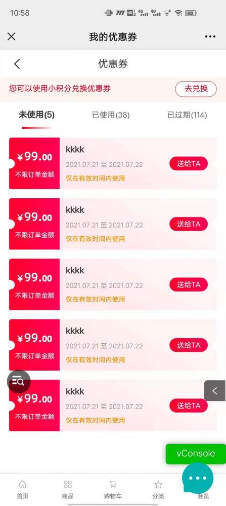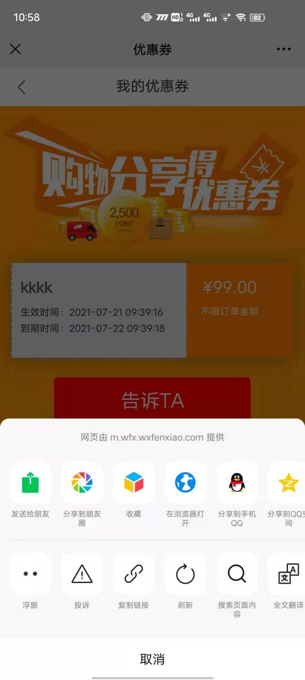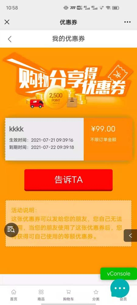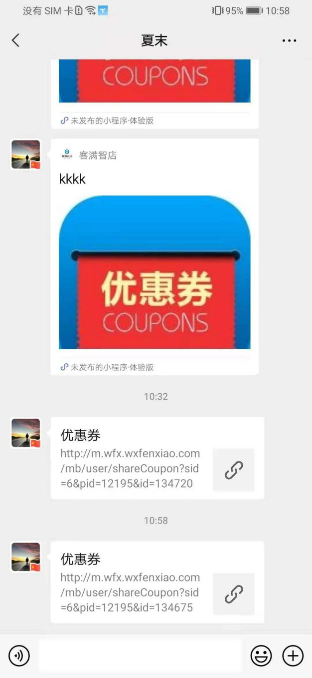 用戶場(chǎng)景:購(gòu)物分享得優(yōu)惠券活動(dòng),在小程序優(yōu)惠券點(diǎn)擊送給TA可以正常使用