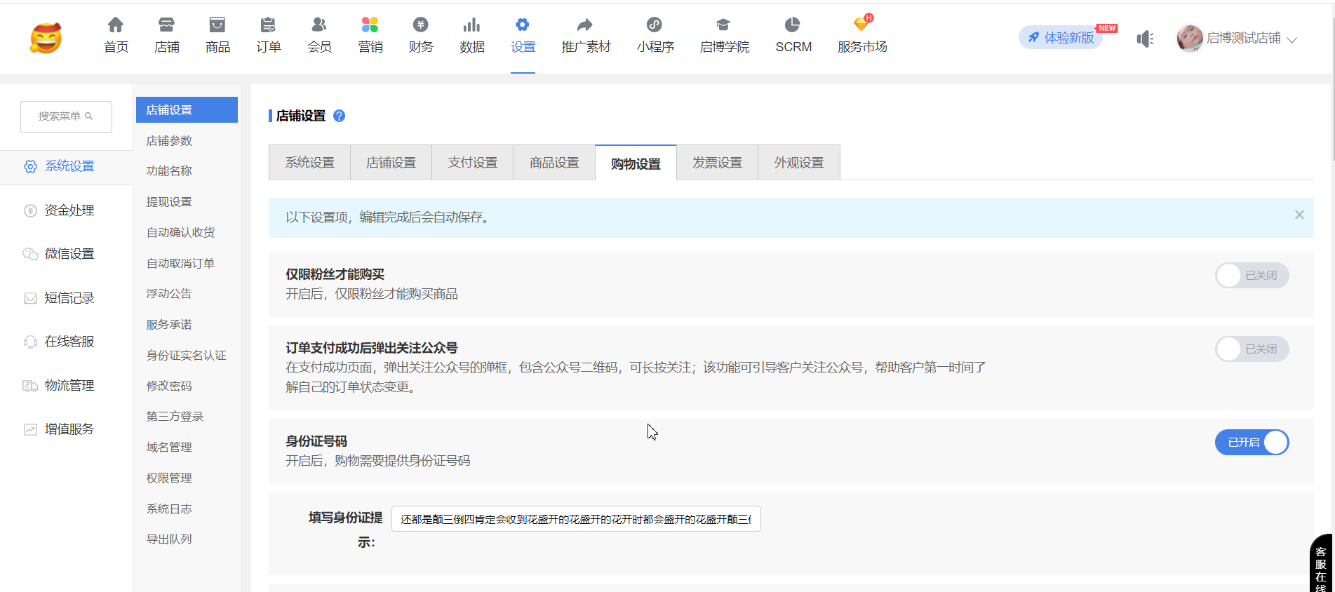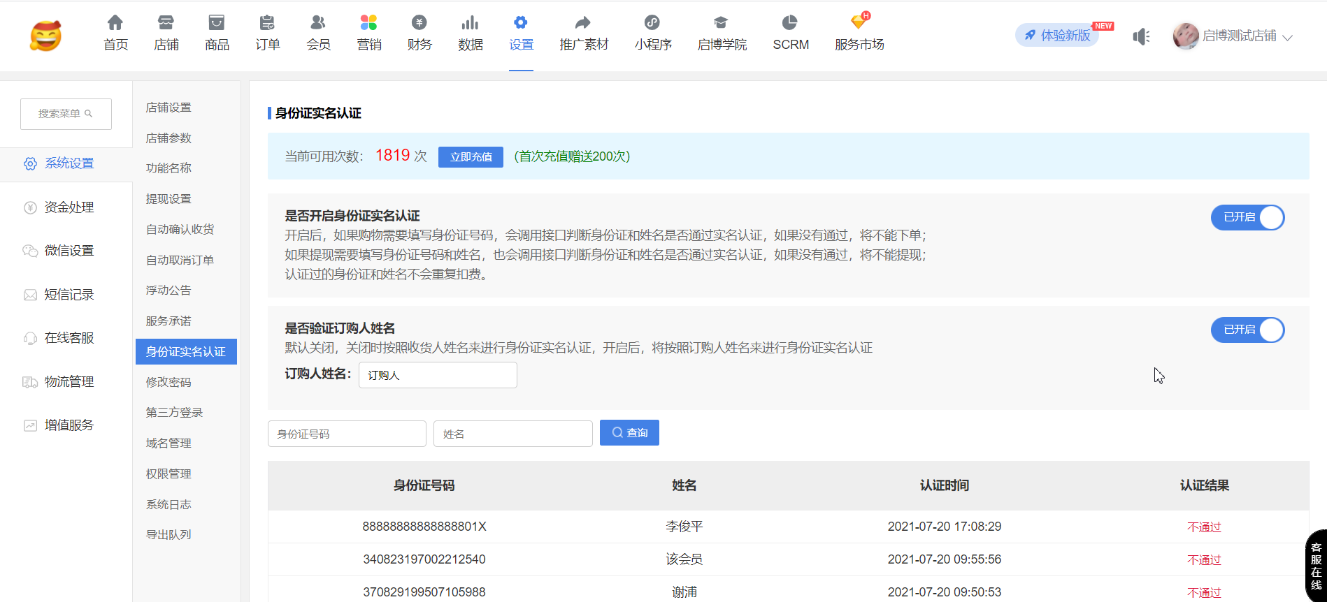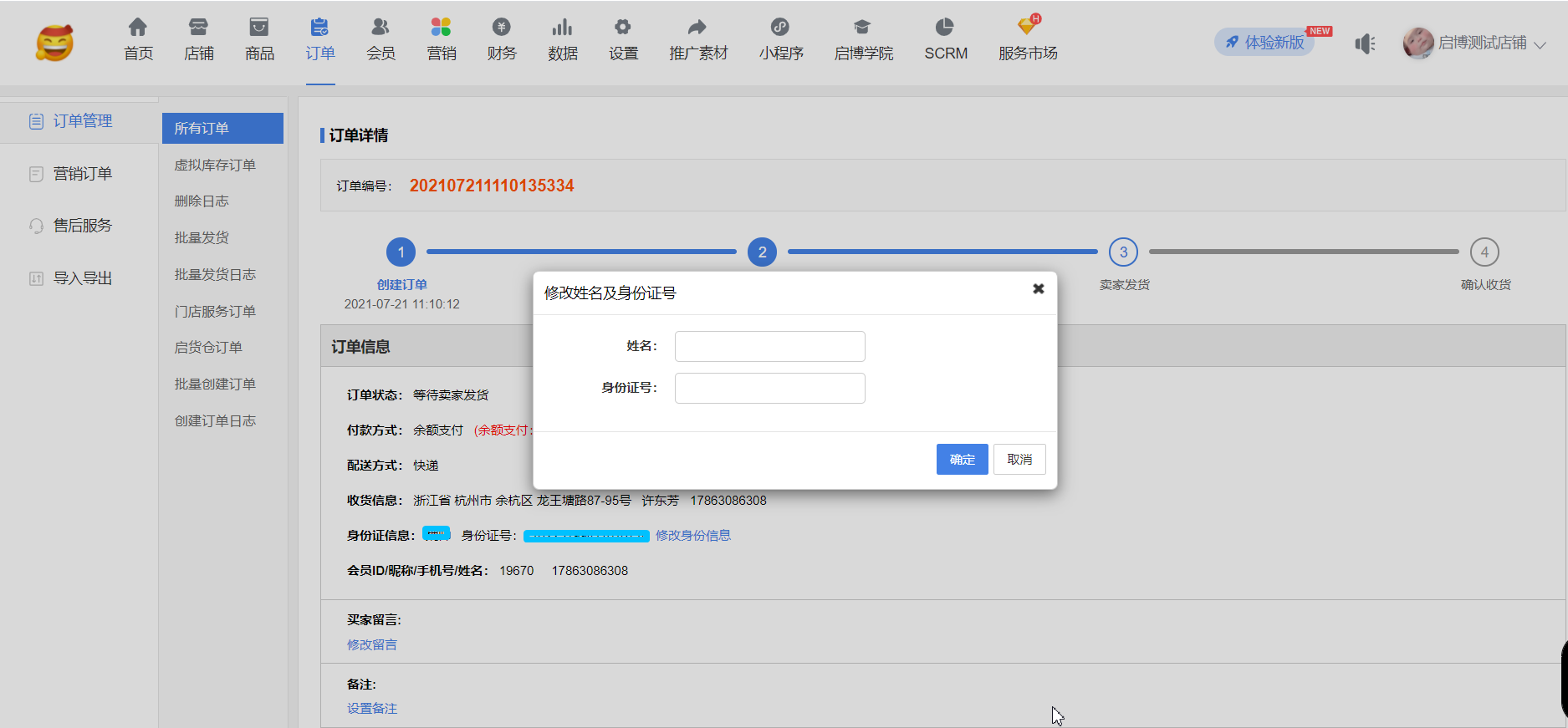 用戶場(chǎng)景:系統(tǒng)設(shè)置-店鋪設(shè)置-開啟”跨境電商模式”、”身份證號(hào)碼”;同時(shí),系統(tǒng)設(shè)置-“身份證實(shí)名認(rèn)證”,”是否開啟身份證實(shí)名認(rèn)證”和”是否驗(yàn)證訂購(gòu)人姓名”開啟后,在手機(jī)端訂單詳情可以修改”訂購(gòu)人”信息,后臺(tái)訂單詳情同步修改后”訂購(gòu)人”信息。