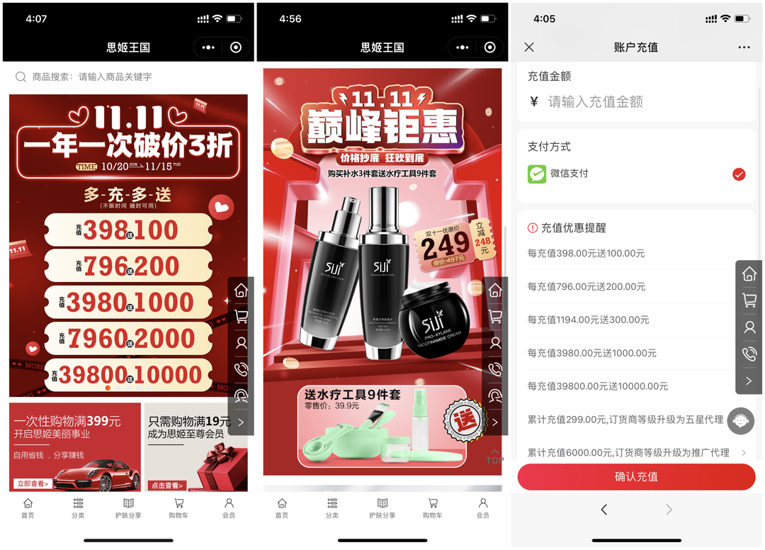 活動(dòng)時(shí)間:10月20日 -11月15日,推出充值返現(xiàn)活動(dòng),并通過(guò)公眾號(hào)關(guān)注有禮、留言有禮,會(huì)員、分銷員、代理商在使用精選好物變美的同時(shí)還能賺錢。