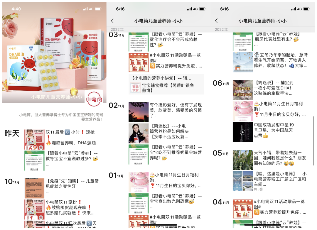 朋友圈內容運營:發圈節奏是每天發2~3條朋友圈;發的內容都是營銷內容,包括商品推薦、營養小課堂、活動福利等;每一條朋友圈都搭配商品多圖一起推送,幾乎每一張海報圖片上都有小程序碼,引導用戶掃碼到小程序購買;
