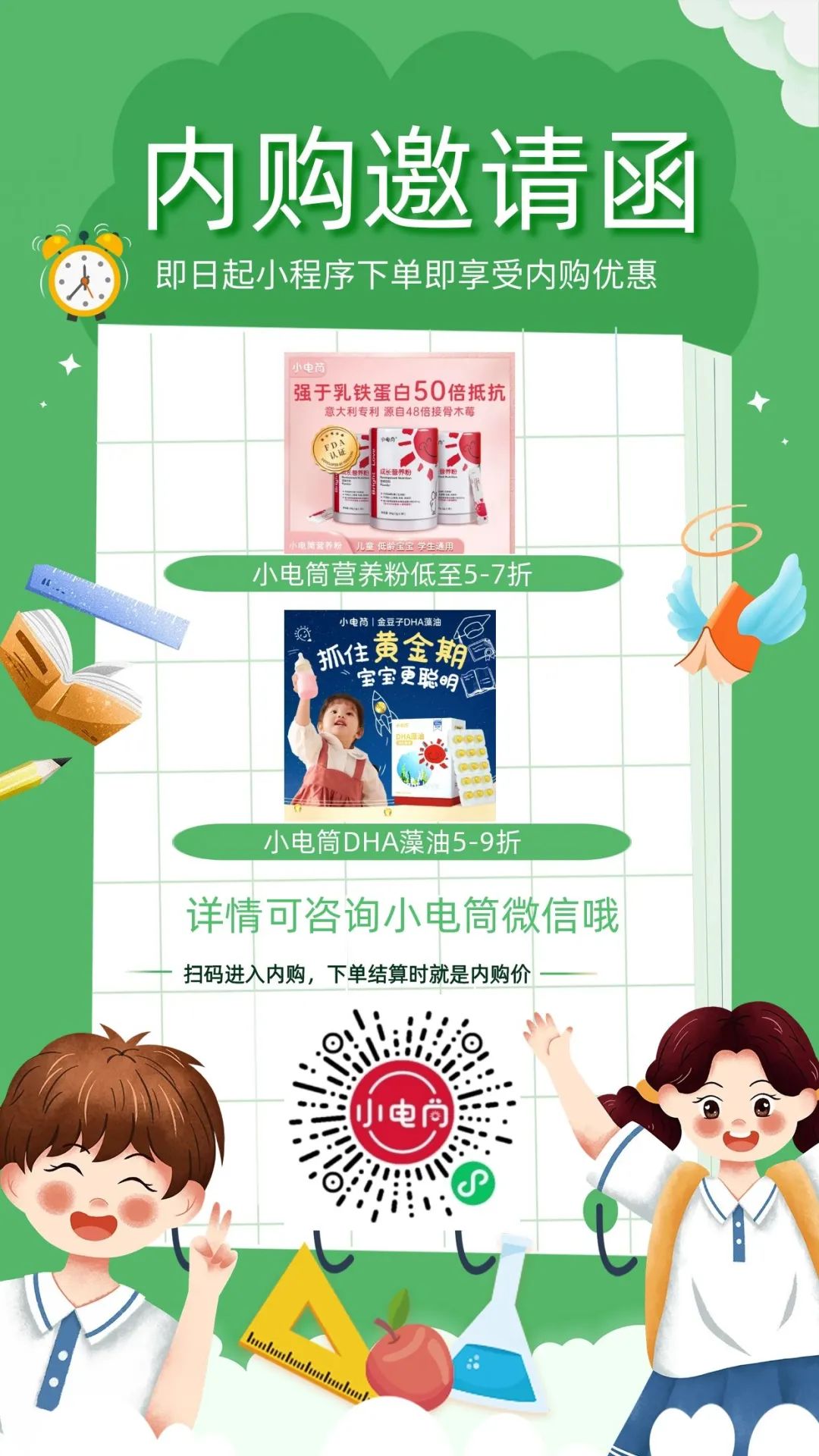 公眾號“小電筒營養粉接骨木莓”——新關注自動回復彈出企微海報——掃描企微海報添加小電筒兒童營養師小小——進入小程序下單。